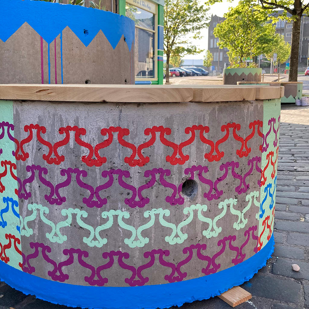 Designs applied to seating and planters on Eliza Street pocket park. Designs inspired by the Jewels Stobswell. To give a homely feel I coordinated and clashed patterns on the seating and planters which complimented the range of surfaces of the birch, concrete and planting.