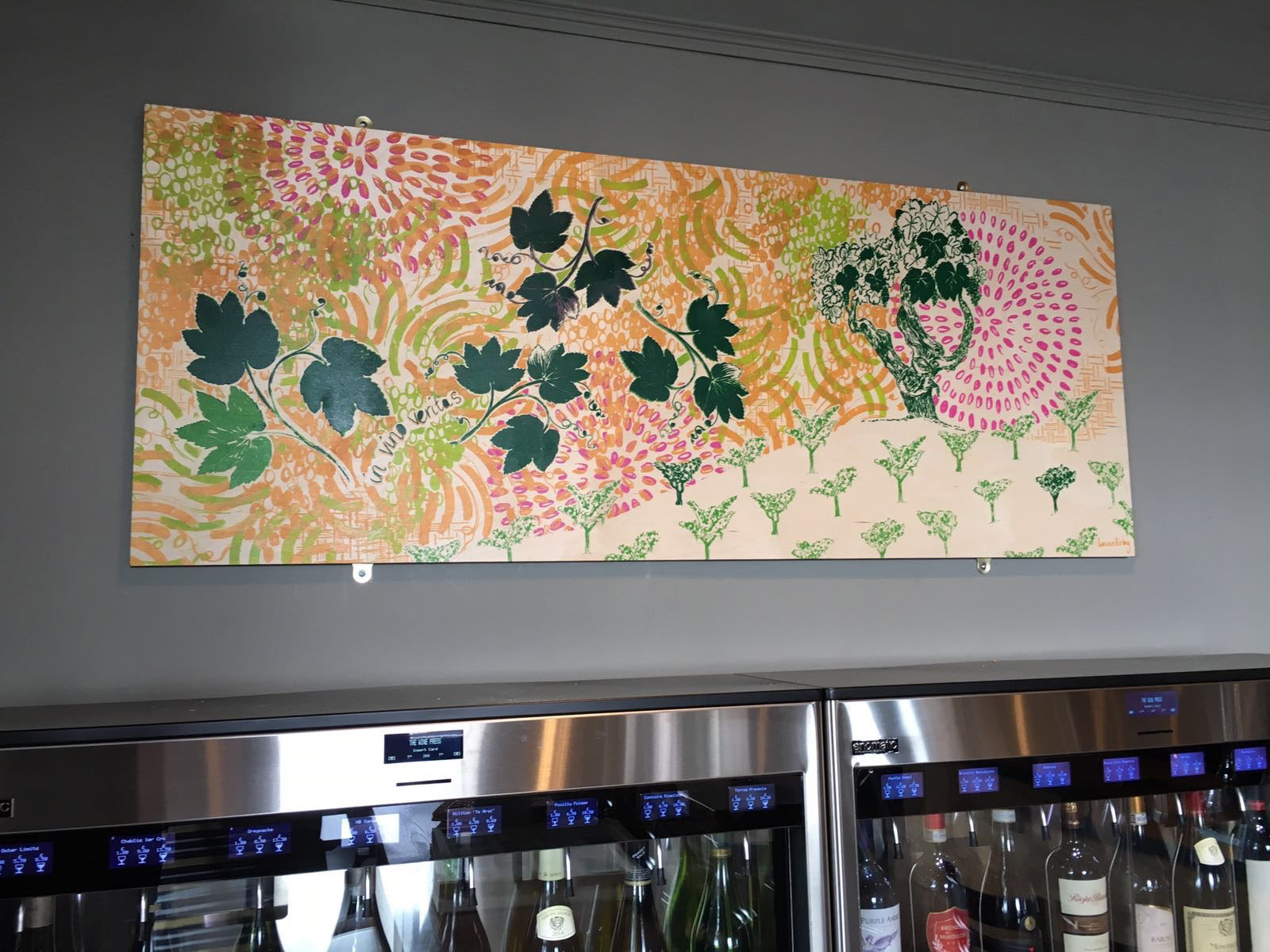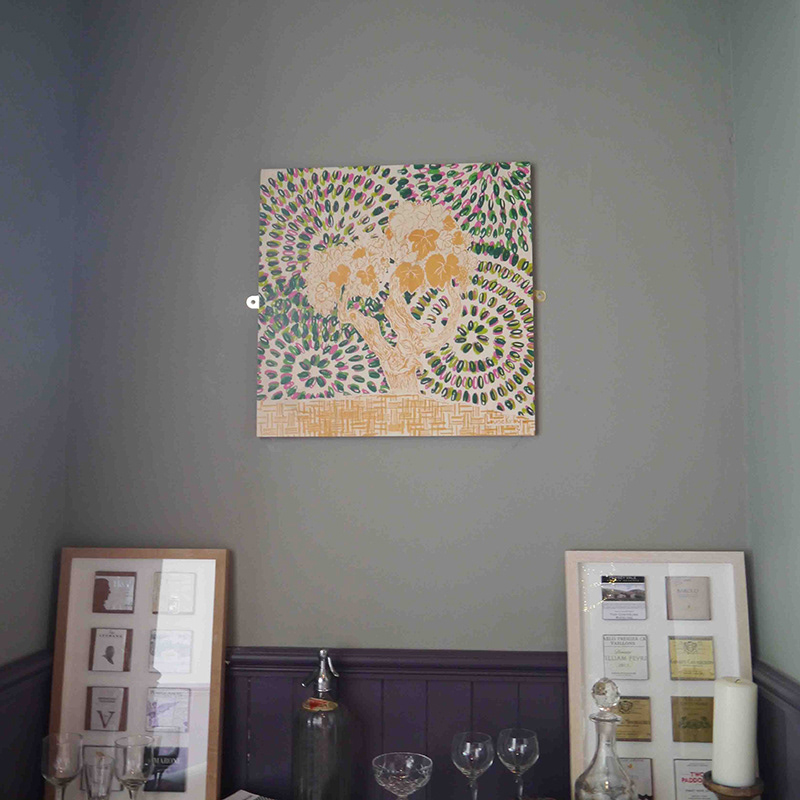 The Wine Press commissioned me to create artwork for their wine bar in Dundee. I created four bespoke pieces for their interior space that would lead the eye round and add as an accent colour, imagery and joy. Each piece is hand screen printed on wood. If you would like to commission me drop me an email on hello@louisekirby.com